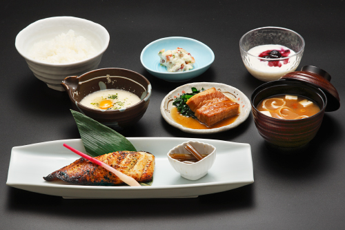 ・豚の角煮・とろろ・小鉢・御飯・味噌汁・デザート
